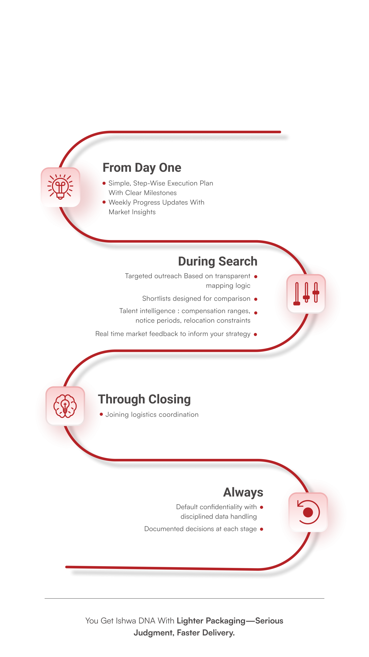 Every EDGE search maintains Ishwa’s non-negotiable standards: rigorous screening, discreet outreach, fit assessment, and market feedback. What changes is packaging and process efficiency—not the judgment that defines our work.